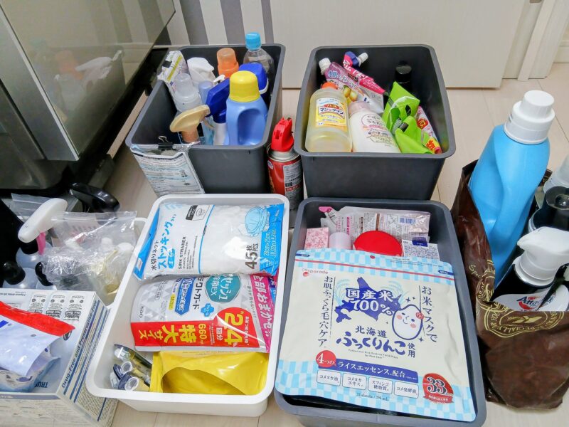 観音扉の中は、ダイソーの収納ボックスで構成しています。