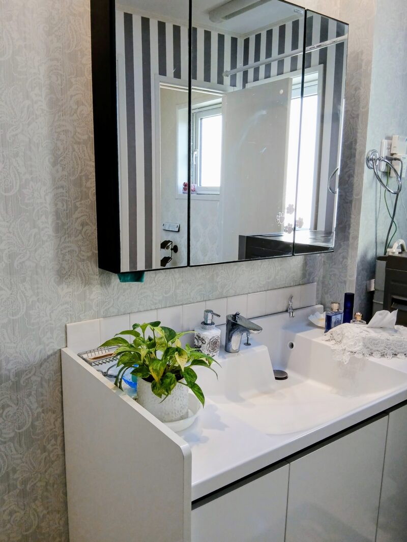 鏡を小さくすることで、圧迫感がなく、壁面が増えスッキリとした印象になりましたが、収納面を重視し110cmのモノにすればよかった気もします。
