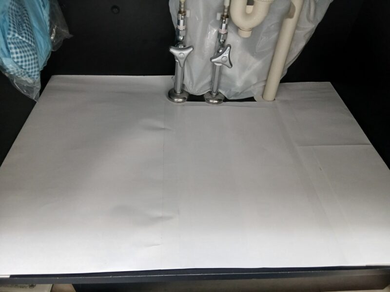 以前のブログでも紹介していますが、収納の下にはカレンダーを敷いて汚れや傷防止にしています。私はここ以外でも冷蔵庫内に至るまで、ほぼすべての棚や引き出しにはカレンダーを敷いています。