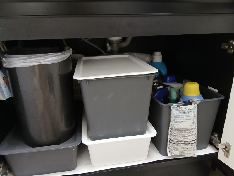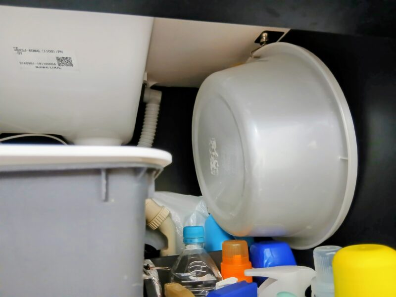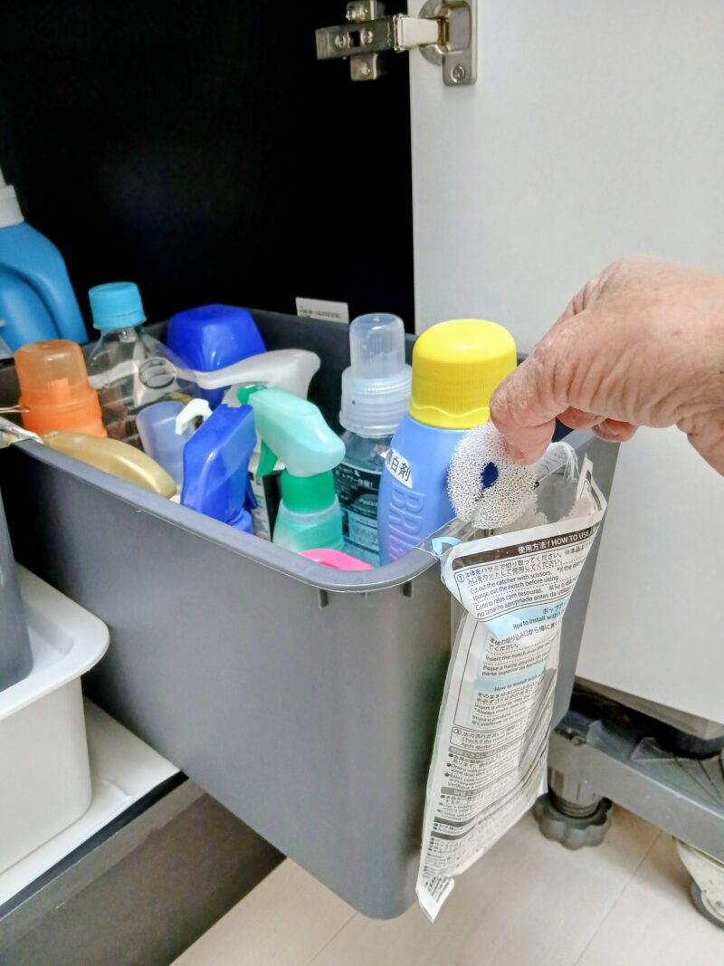 奥の排水管の間には形が自在になるビニール袋に収納しています。