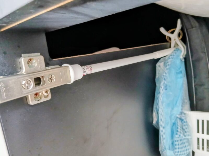 扉金具に突っ張り棒をつければ、ぶら下げ収納が出来ます。