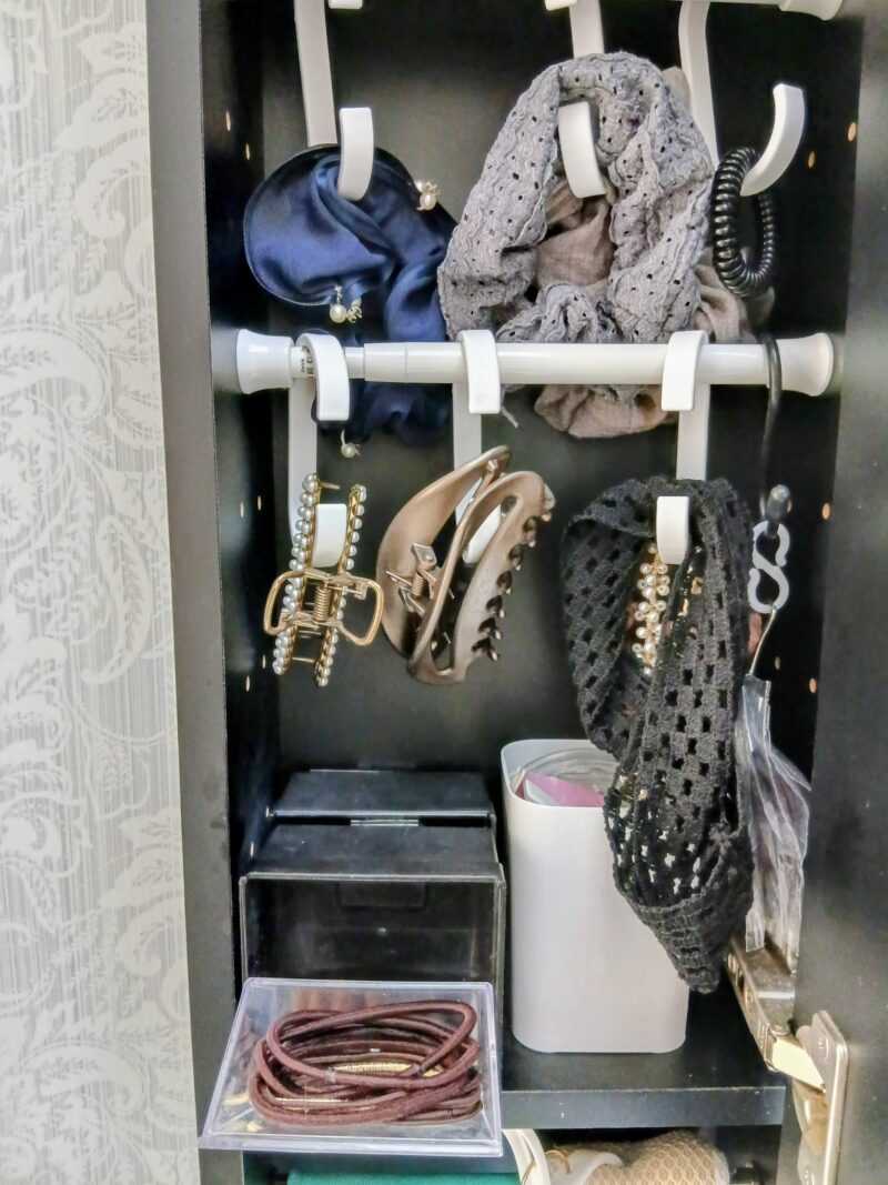 左側は、突っ張り棒にC字フックを引っ掛けてシュシュやバレッタを取り出しやすくしました。