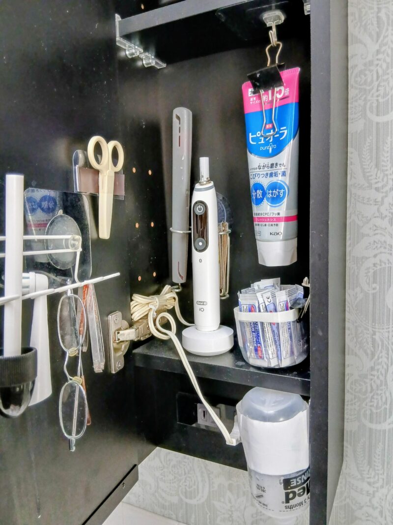 100均グッズの貼って剥がせるフックを利用して歯磨き粉をぶら下げたり、マグネットを貼り付けて鼻うがいボトルやハサミを浮かせる収納しています。