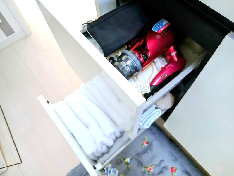 我が家では引き出し上段はドライヤーとヘヤーアイロンなど計3本を収納し、下段はフェイスタオルが入っています。