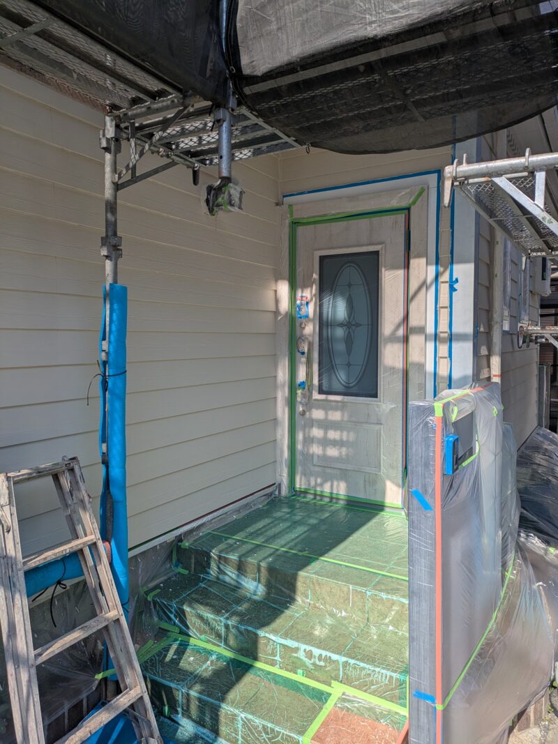 今回は弊社で13年前に新築されたお宅での外壁の塗装更新工事やバルコニー防水更新工事や玄関ドア交換工事なども行っています。