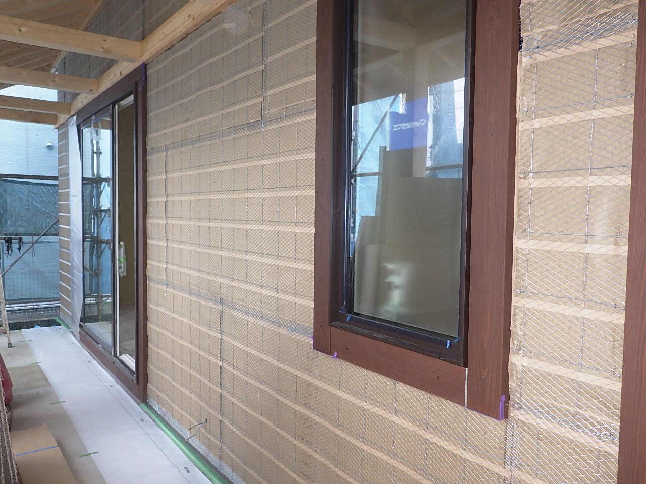 内部では造作工事、外部では外装工事がそれぞれ始まっています。 通気ラス 今回の外壁は俗にいう「ラス下地モルタル塗り」の上ジョリパット仕上げです。上記写真は軽量モルタル施工用の通気ラスという部材で、左官屋さんの分業で専門の’ラス屋さん’という...